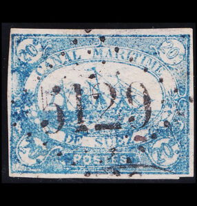 A used example with the numeral cancel 5129 from Port Said. One of the most popular stamp issues, only about 40 days in use, often forged. With different degrees od scarcity, the 20 c. is the most common weather used or unused or on cover. The stamps weren’t a country issue but printed for the…
