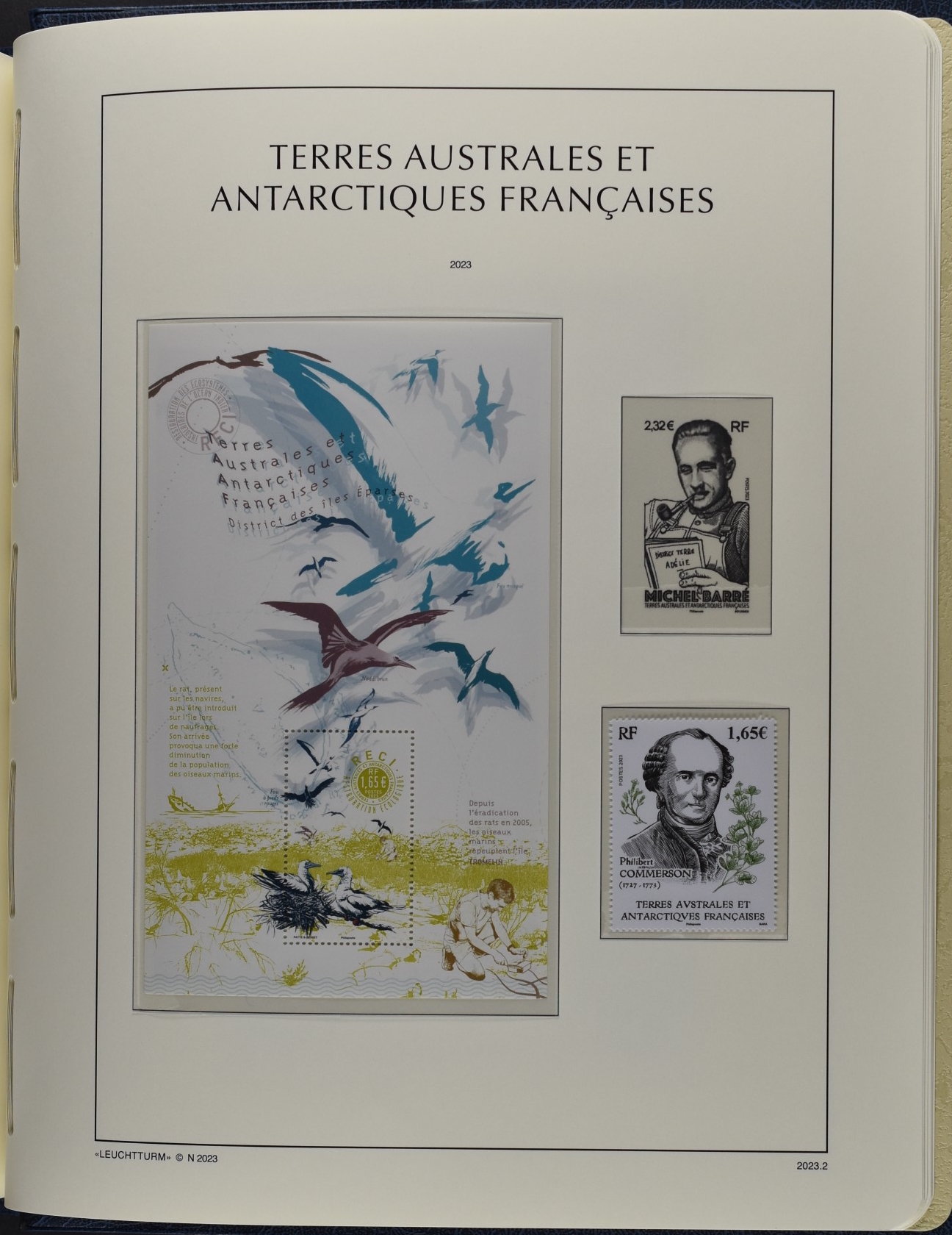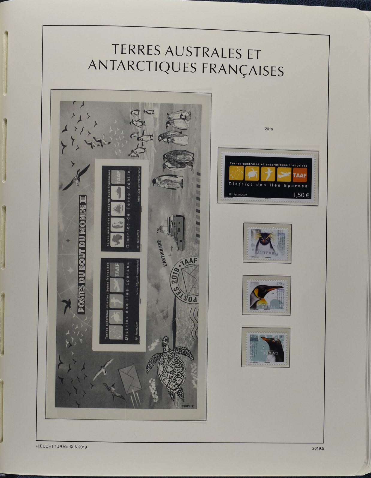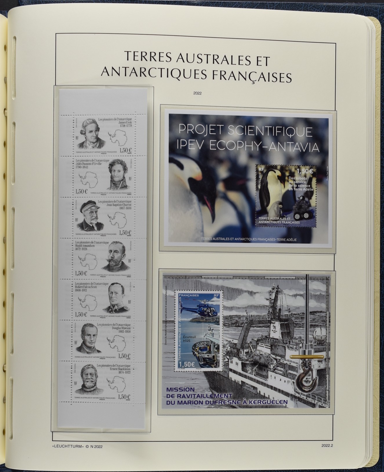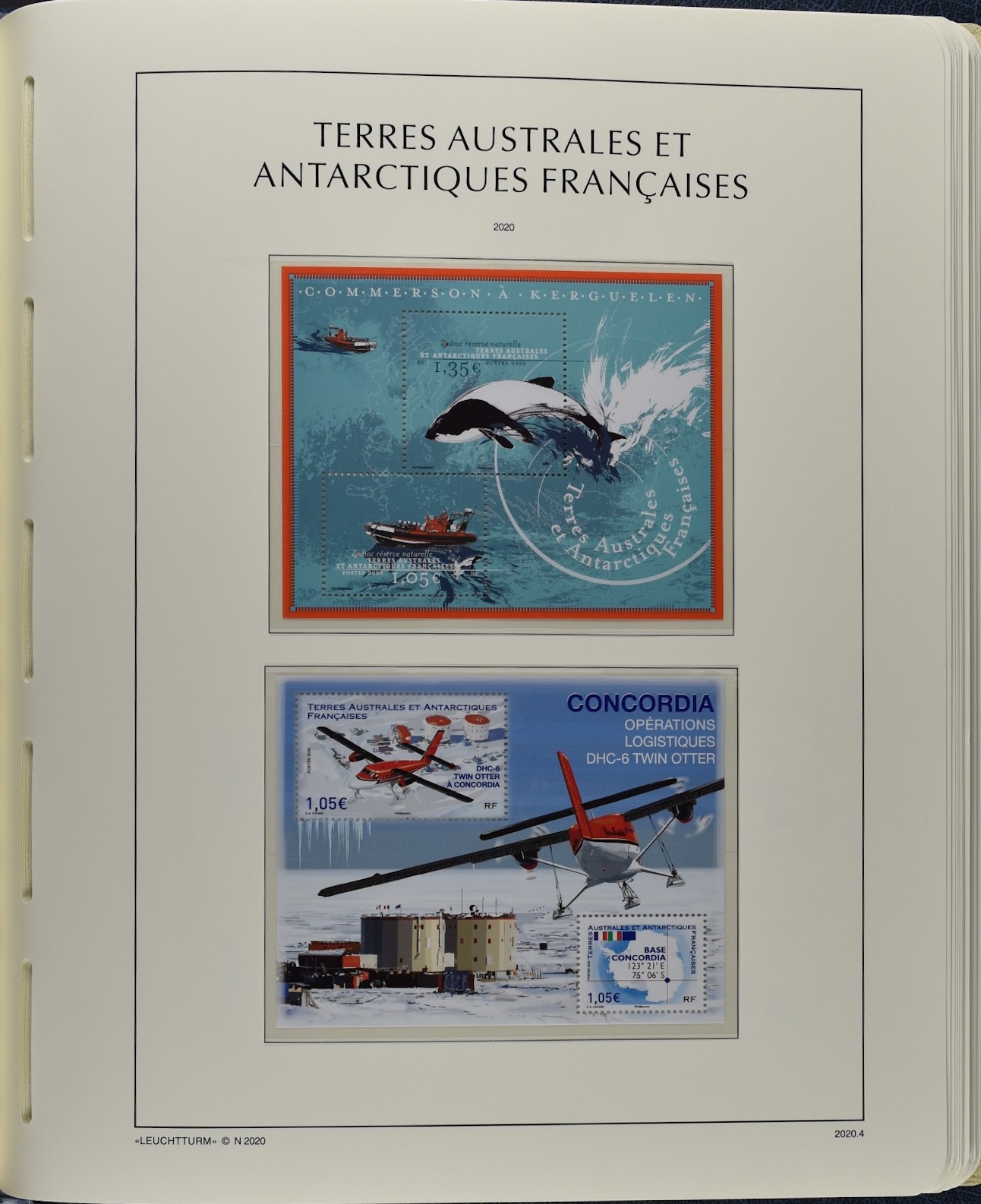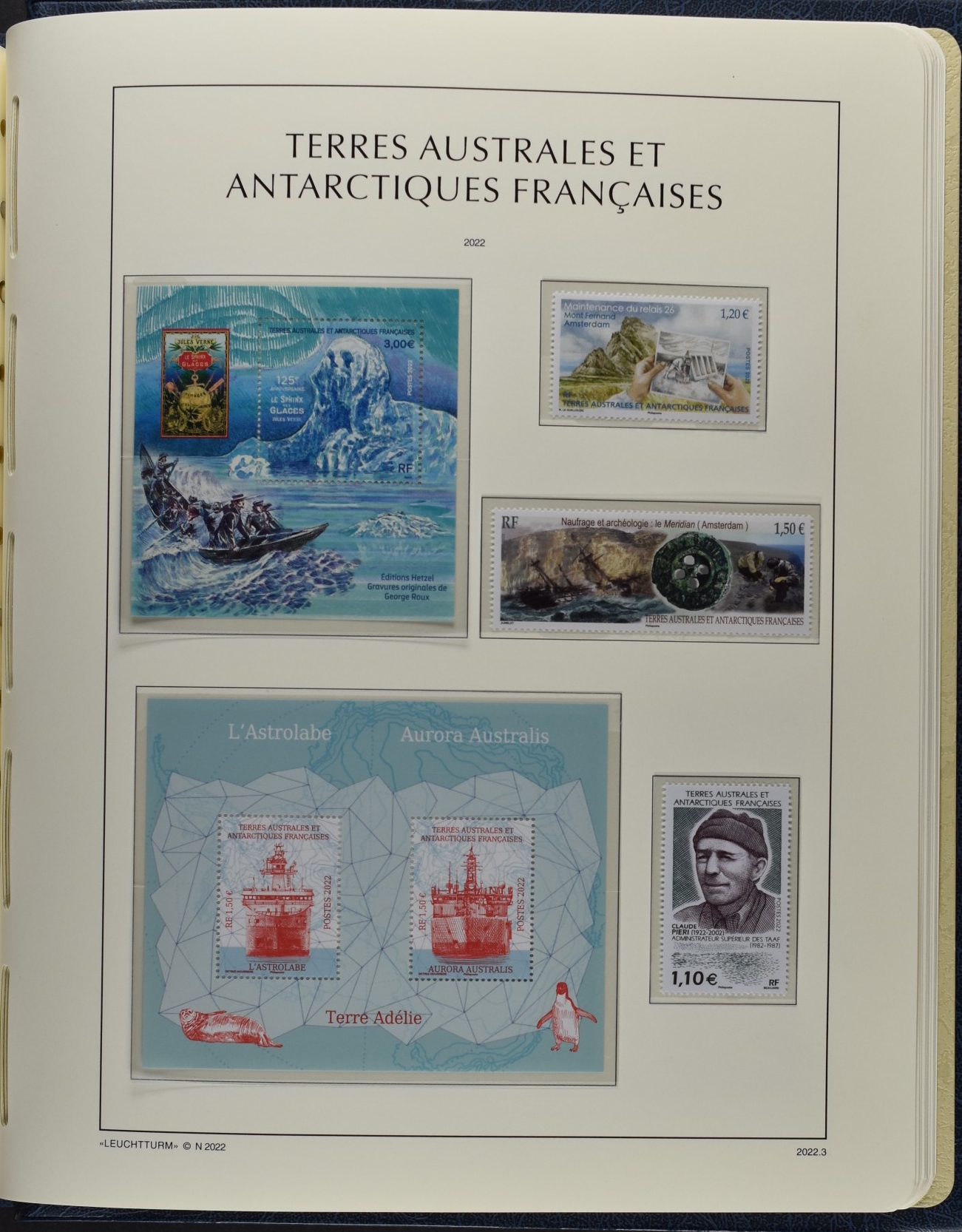Prachtvolle moderne Sammlung der Französischen Austral- und Antarktisgebiete im luxuriösen Leuchtturm-Vordruckalbum mit Schuber. Nahezu vollständig, nur wenige Lücken, durchgehend in postfrischer Erhaltung. Die Sammlung besticht durch zahlreiche attraktive Ausgaben mit Motiven aus der Tier- und Pflanzenwelt, darunter viele Blöcke und Markenheftchen. Abgedeckt wird der Zeitraum 2010–2023, mit einem Katalogwert gemäss Yvert von rund € 1’160. Ergänzt wird die Kollektion durch eine Partie der Jahre 2001–2009 im Einsteckbuch mit einem zusätzlichen Yvert-Katalogwert von ca. € 450. Gesamtkatalogwert somit ca. € 1’610.