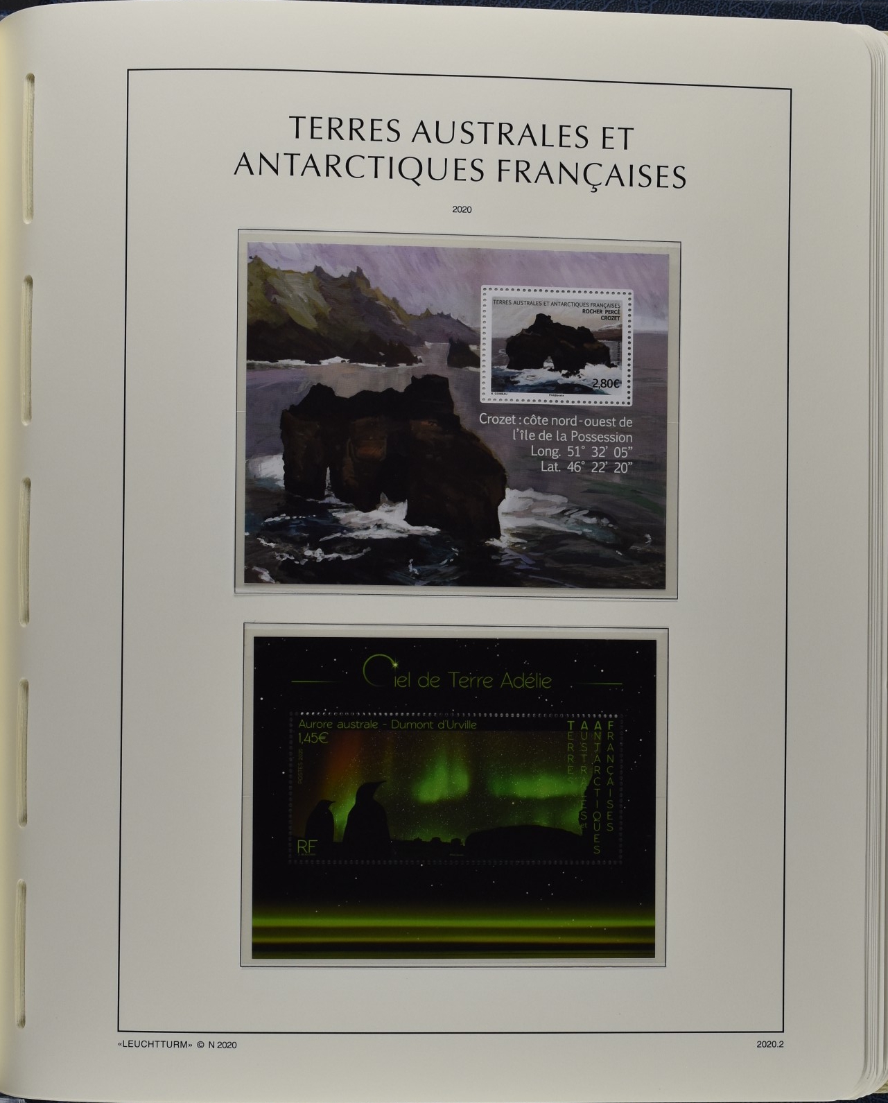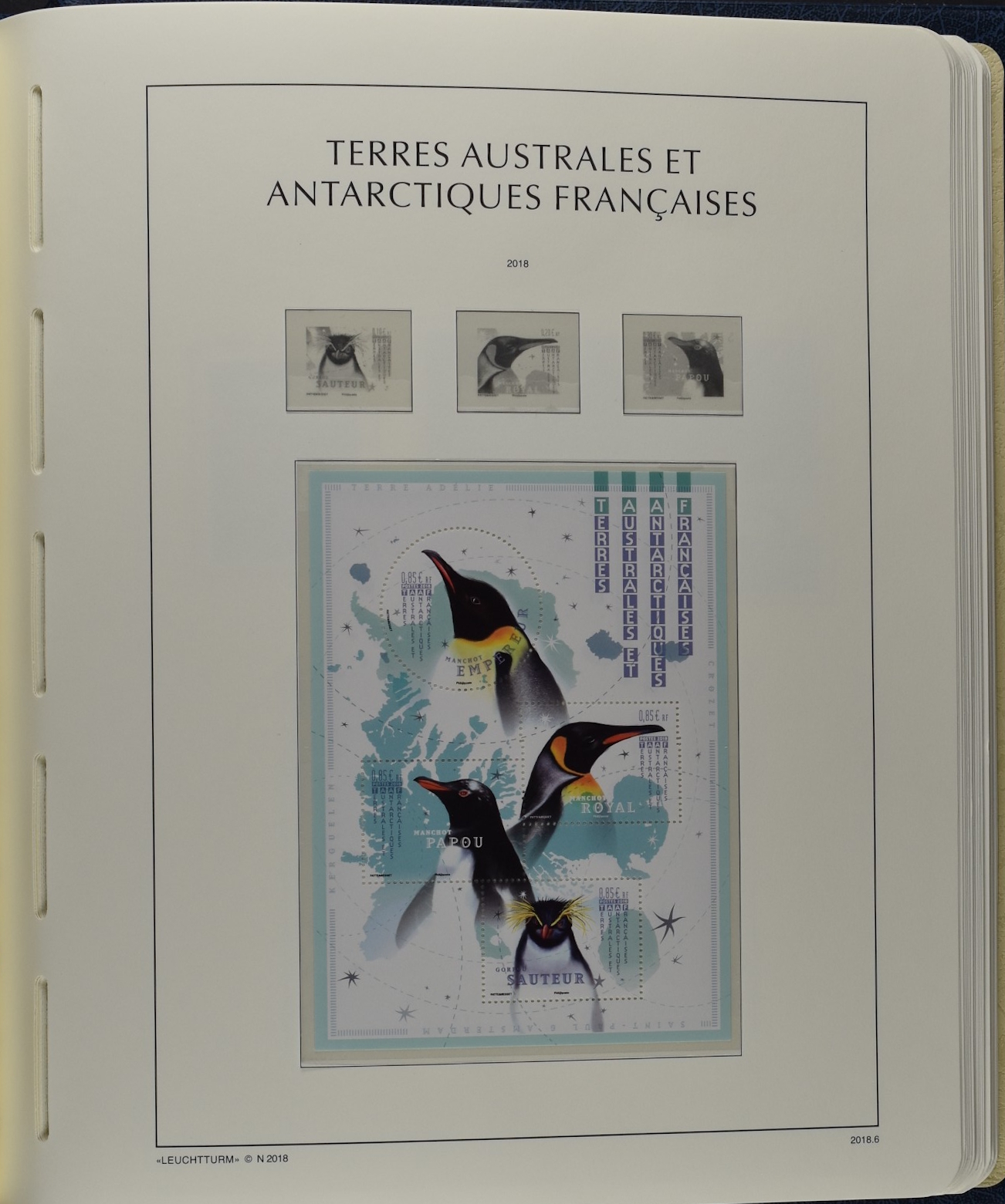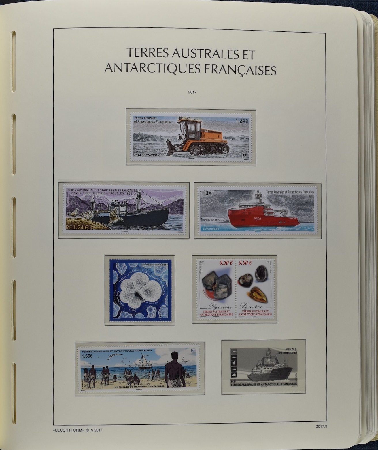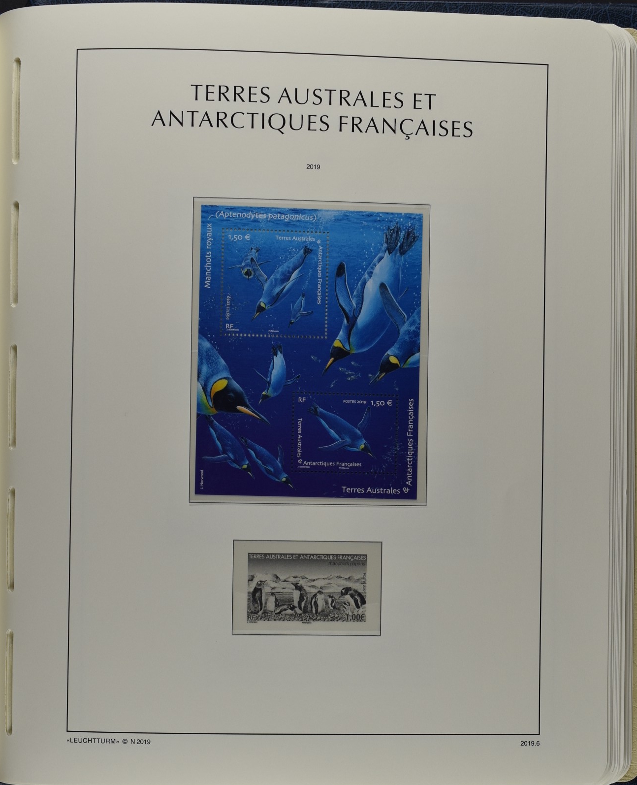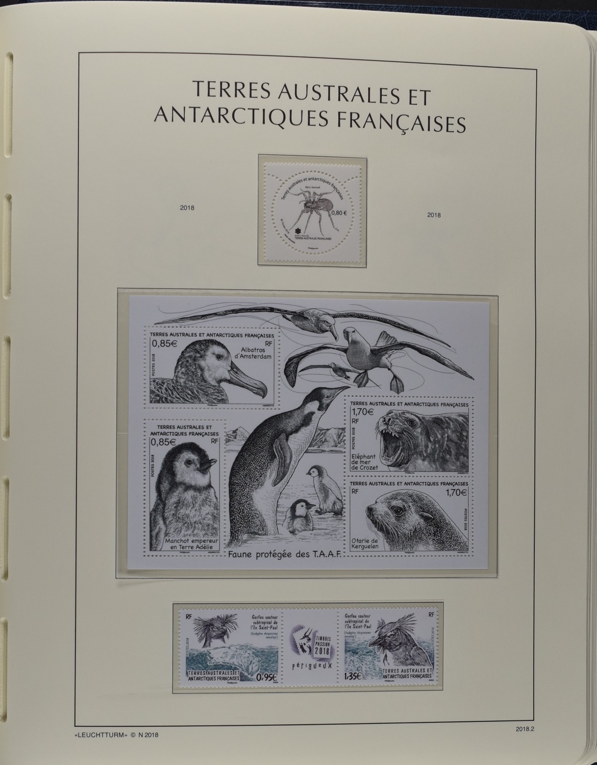 Prachtvolle moderne Sammlung der Französischen Austral- und Antarktisgebiete im luxuriösen Leuchtturm-Vordruckalbum mit Schuber. Nahezu vollständig, nur wenige Lücken, durchgehend in postfrischer Erhaltung. Die Sammlung besticht durch zahlreiche attraktive Ausgaben mit Motiven aus der Tier- und Pflanzenwelt, darunter viele Blöcke und Markenheftchen. Abgedeckt wird der Zeitraum 2010–2023, mit einem Katalogwert gemäss Yvert von rund € 1’160. Ergänzt wird die Kollektion durch eine Partie der Jahre 2001–2009 im Einsteckbuch mit einem zusätzlichen Yvert-Katalogwert von ca. € 450. Gesamtkatalogwert somit ca. € 1’610.