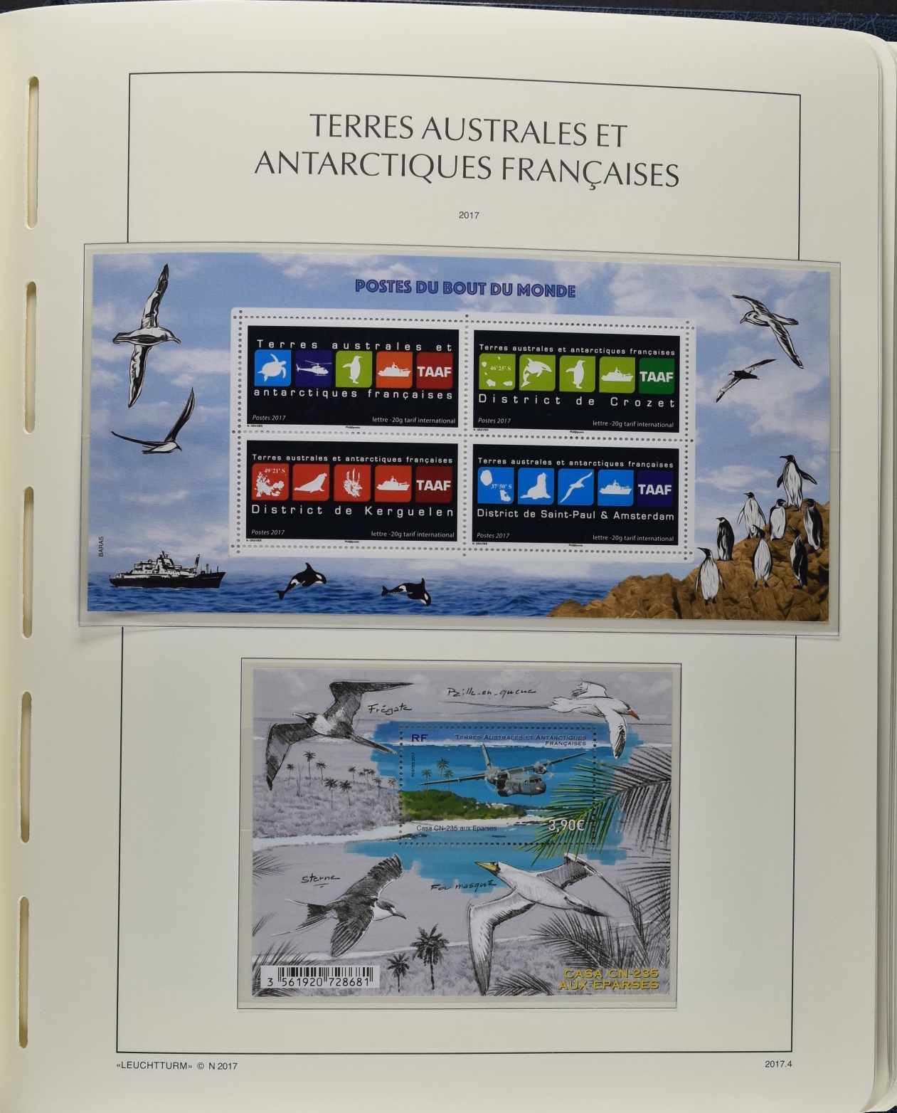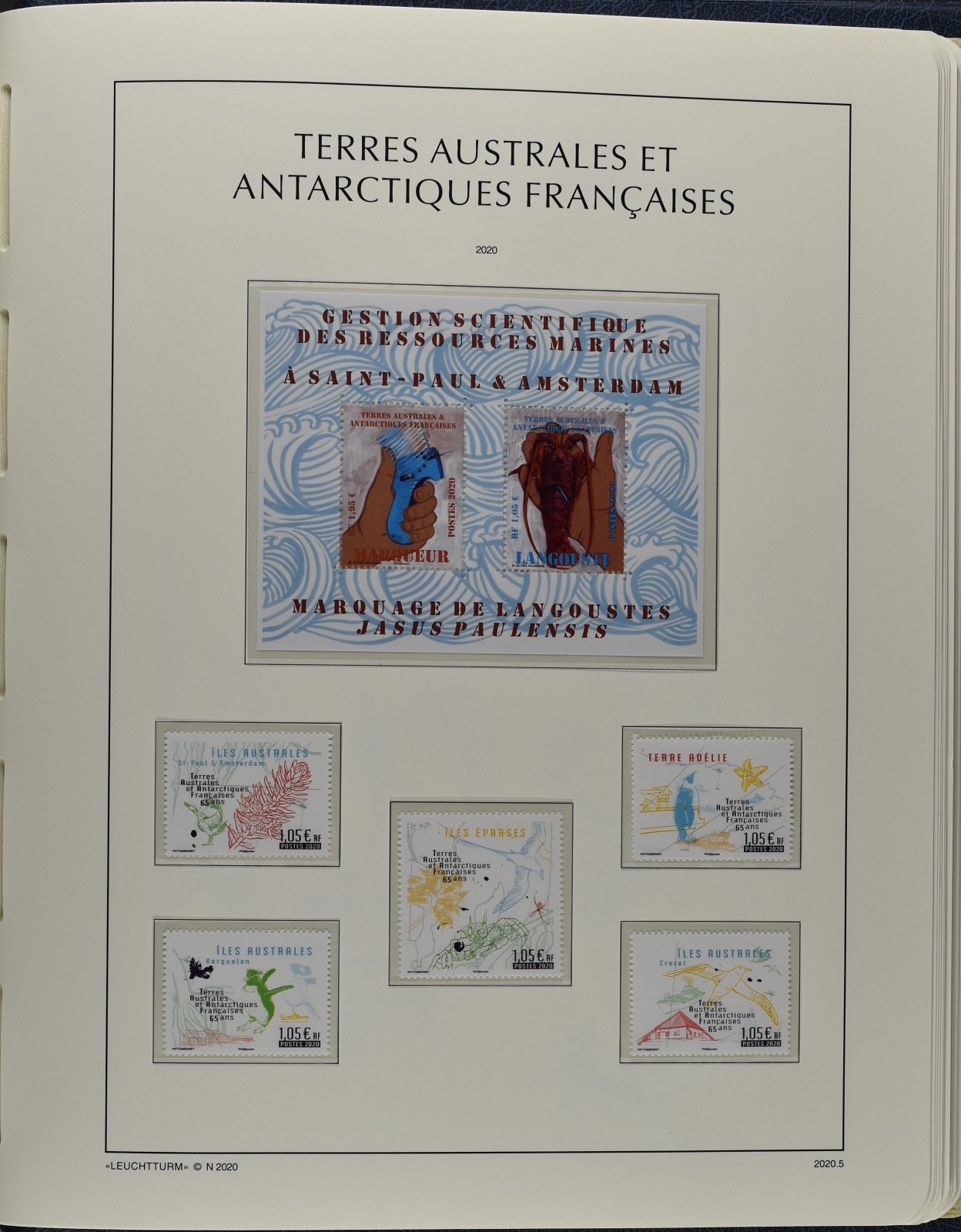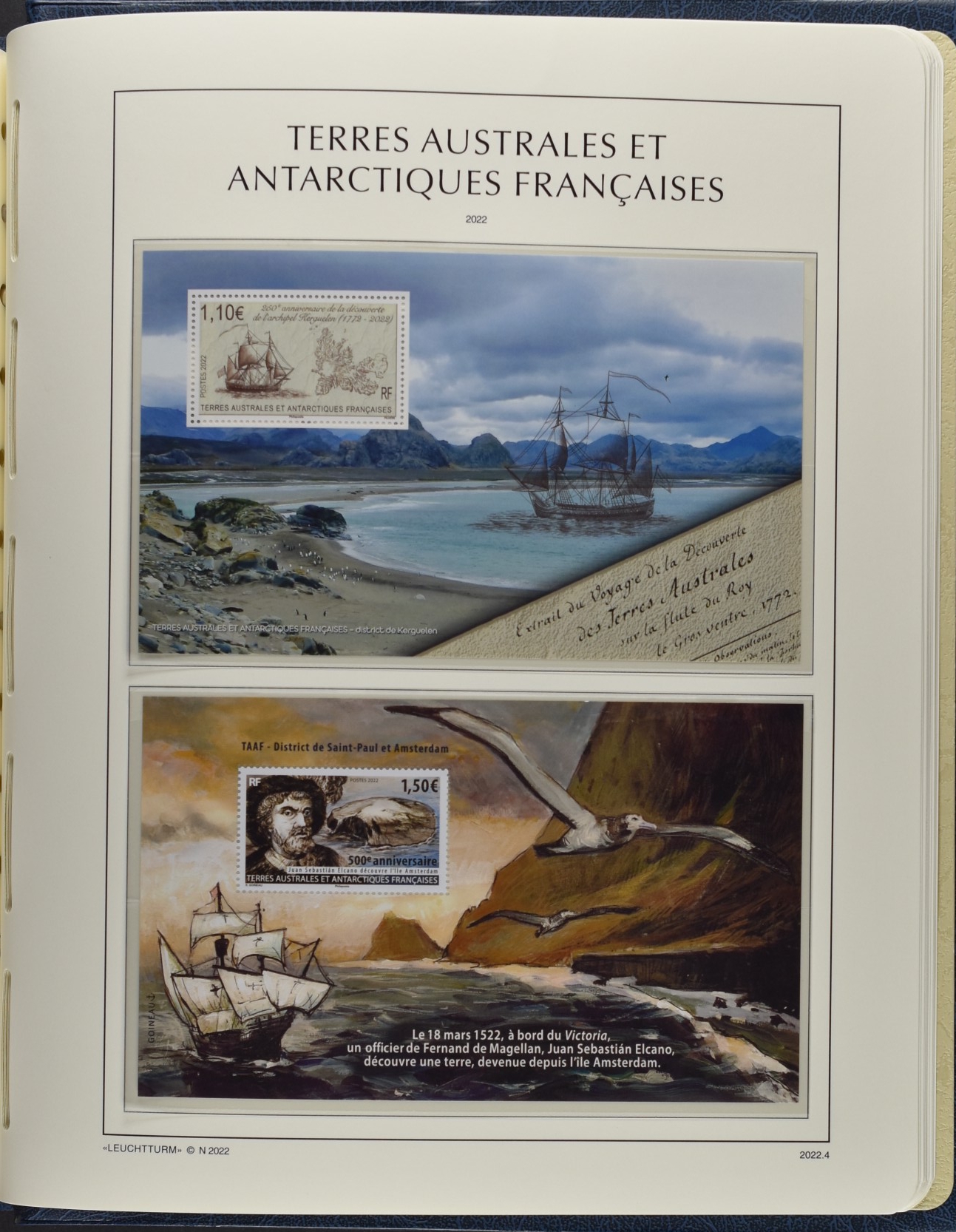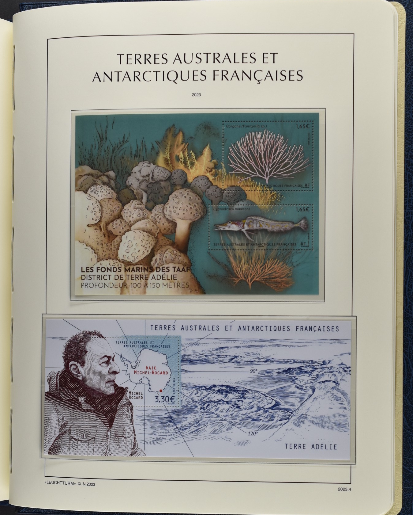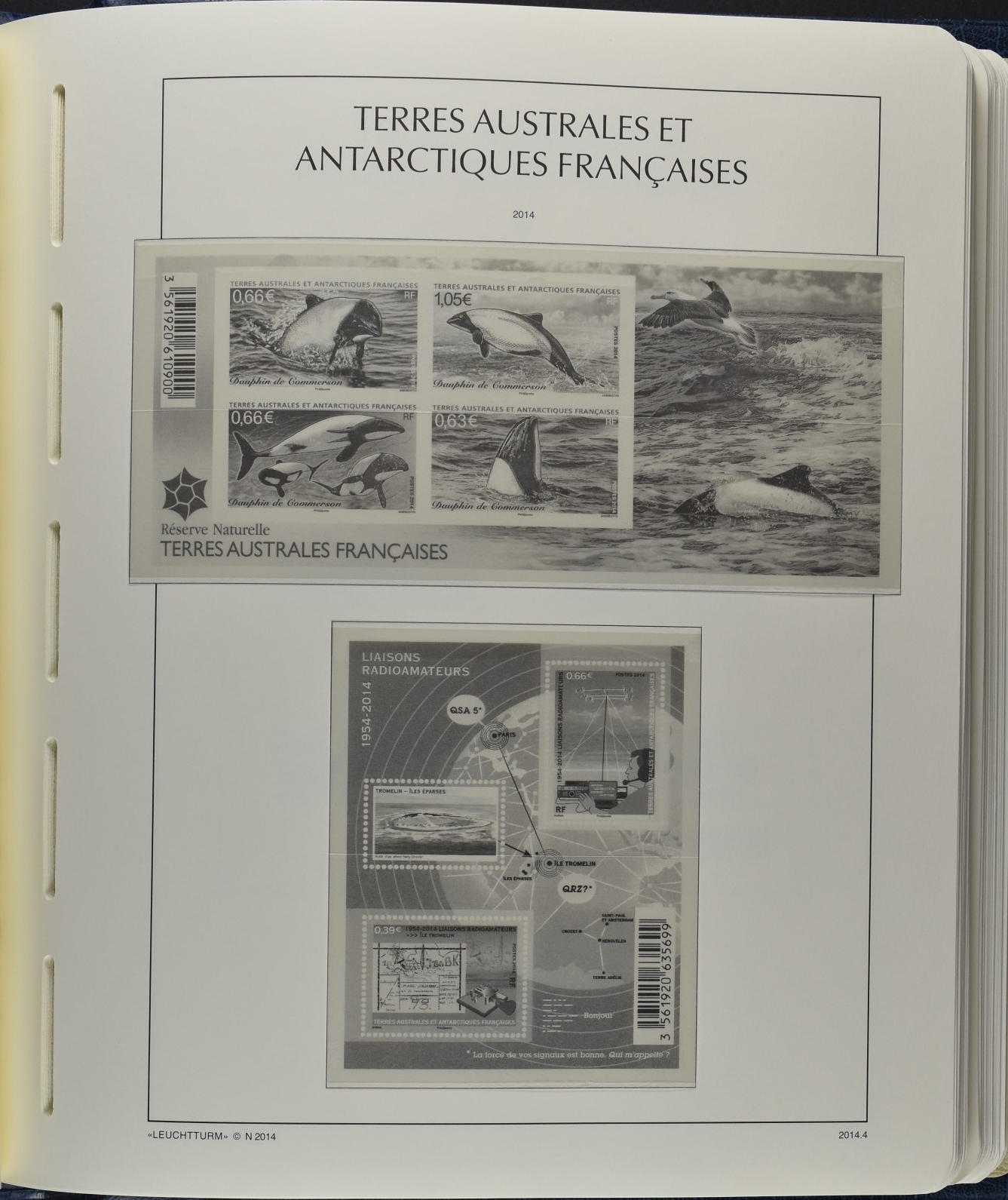 Prachtvolle moderne Sammlung der Französischen Austral- und Antarktisgebiete im luxuriösen Leuchtturm-Vordruckalbum mit Schuber. Nahezu vollständig, nur wenige Lücken, durchgehend in postfrischer Erhaltung. Die Sammlung besticht durch zahlreiche attraktive Ausgaben mit Motiven aus der Tier- und Pflanzenwelt, darunter viele Blöcke und Markenheftchen. Abgedeckt wird der Zeitraum 2010–2023, mit einem Katalogwert gemäss Yvert von rund € 1’160. Ergänzt wird die Kollektion durch eine Partie der Jahre 2001–2009 im Einsteckbuch mit einem zusätzlichen Yvert-Katalogwert von ca. € 450. Gesamtkatalogwert somit ca. € 1’610.