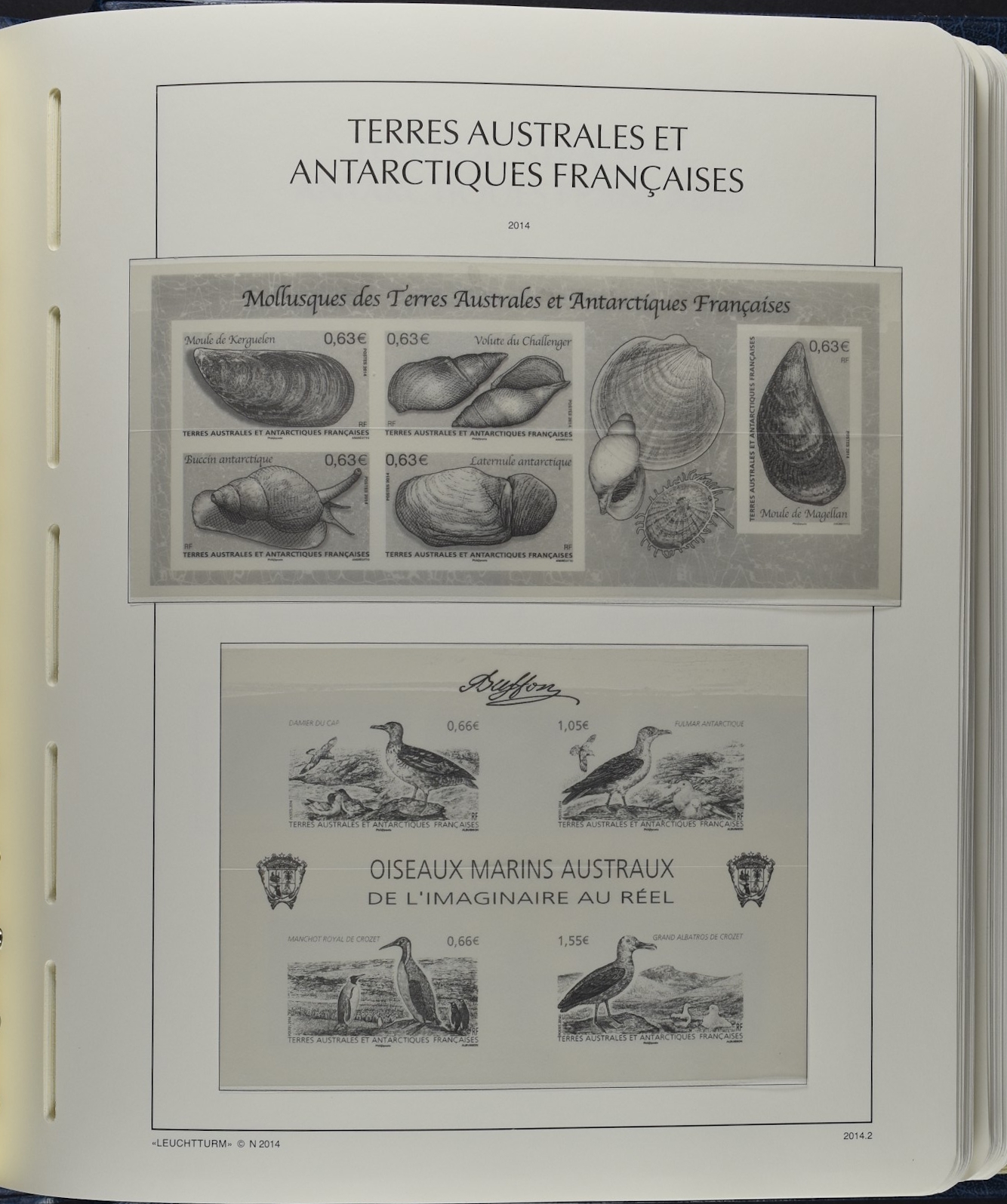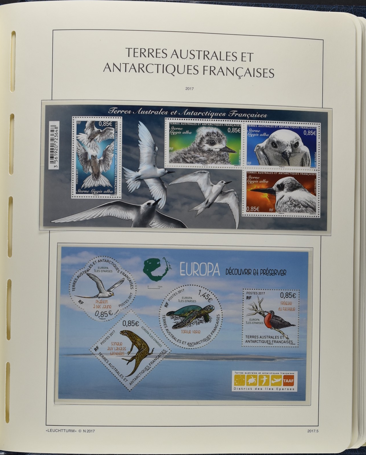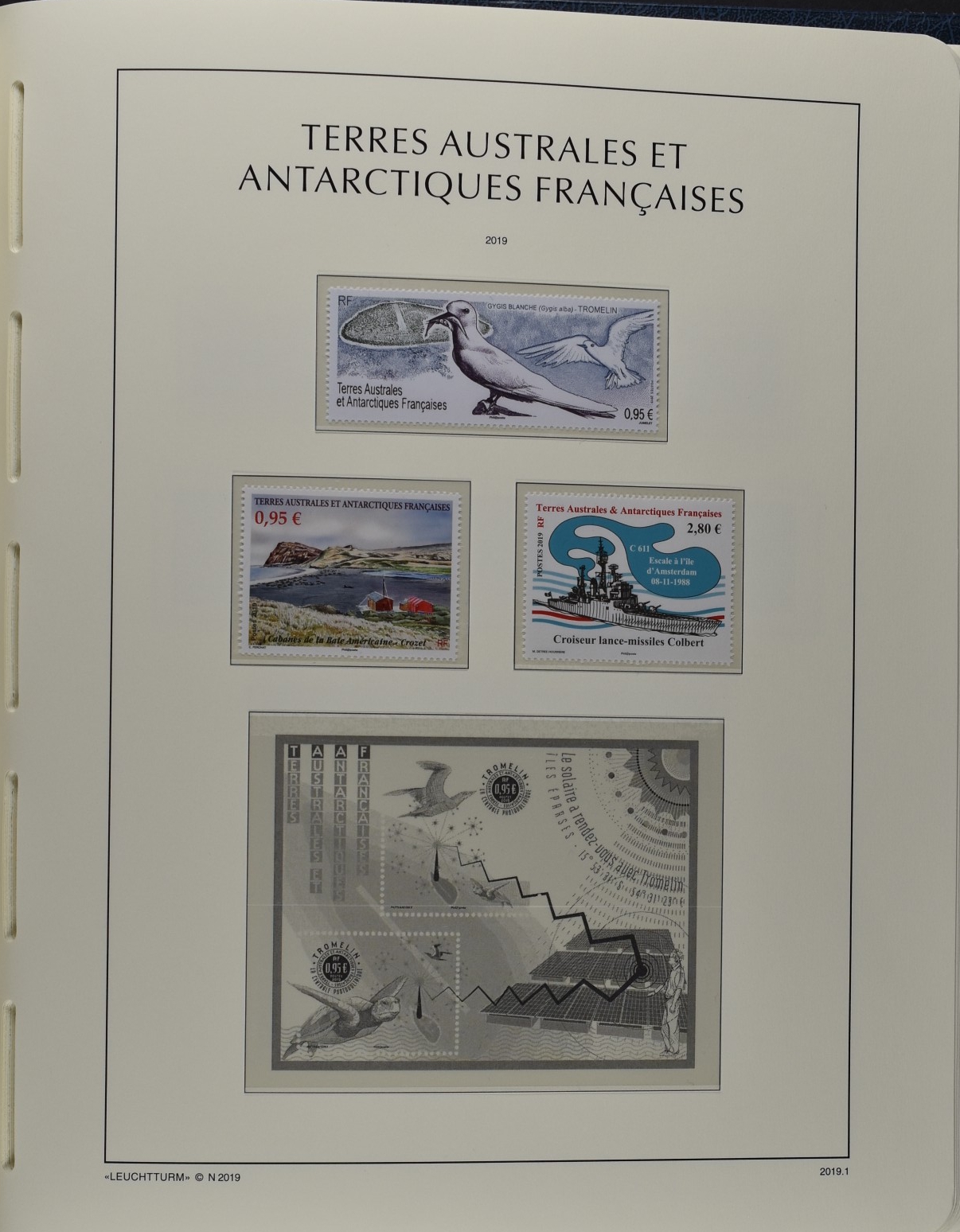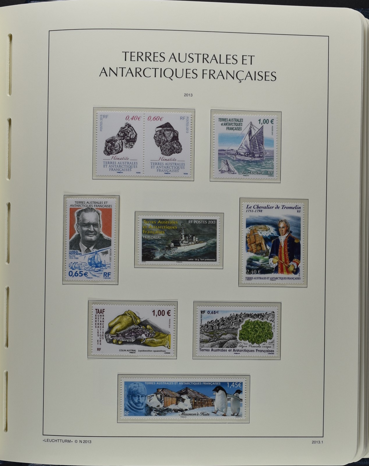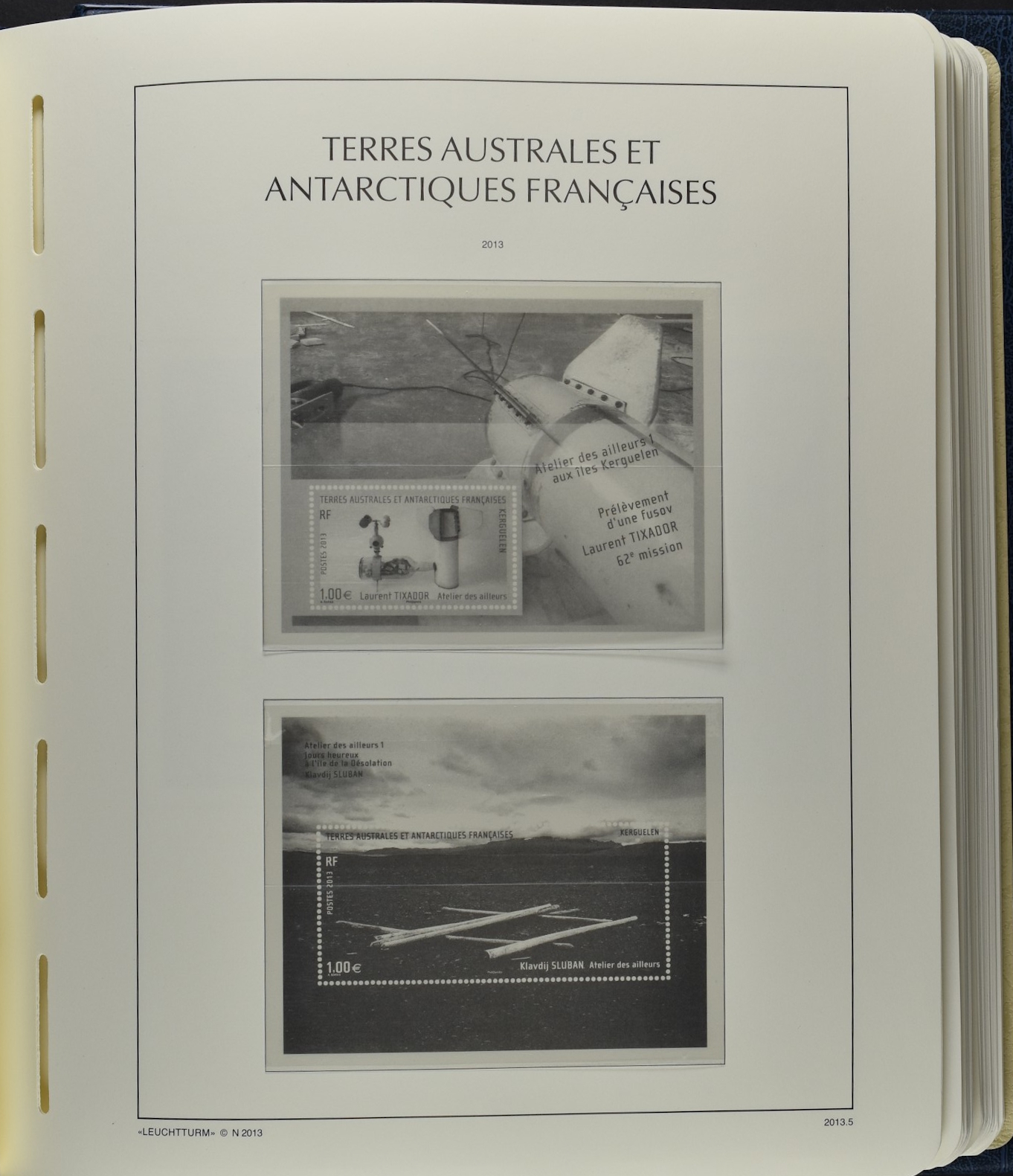 Prachtvolle moderne Sammlung der Französischen Austral- und Antarktisgebiete im luxuriösen Leuchtturm-Vordruckalbum mit Schuber. Nahezu vollständig, nur wenige Lücken, durchgehend in postfrischer Erhaltung. Die Sammlung besticht durch zahlreiche attraktive Ausgaben mit Motiven aus der Tier- und Pflanzenwelt, darunter viele Blöcke und Markenheftchen. Abgedeckt wird der Zeitraum 2010–2023, mit einem Katalogwert gemäss Yvert von rund € 1’160. Ergänzt wird die Kollektion durch eine Partie der Jahre 2001–2009 im Einsteckbuch mit einem zusätzlichen Yvert-Katalogwert von ca. € 450. Gesamtkatalogwert somit ca. € 1’610.