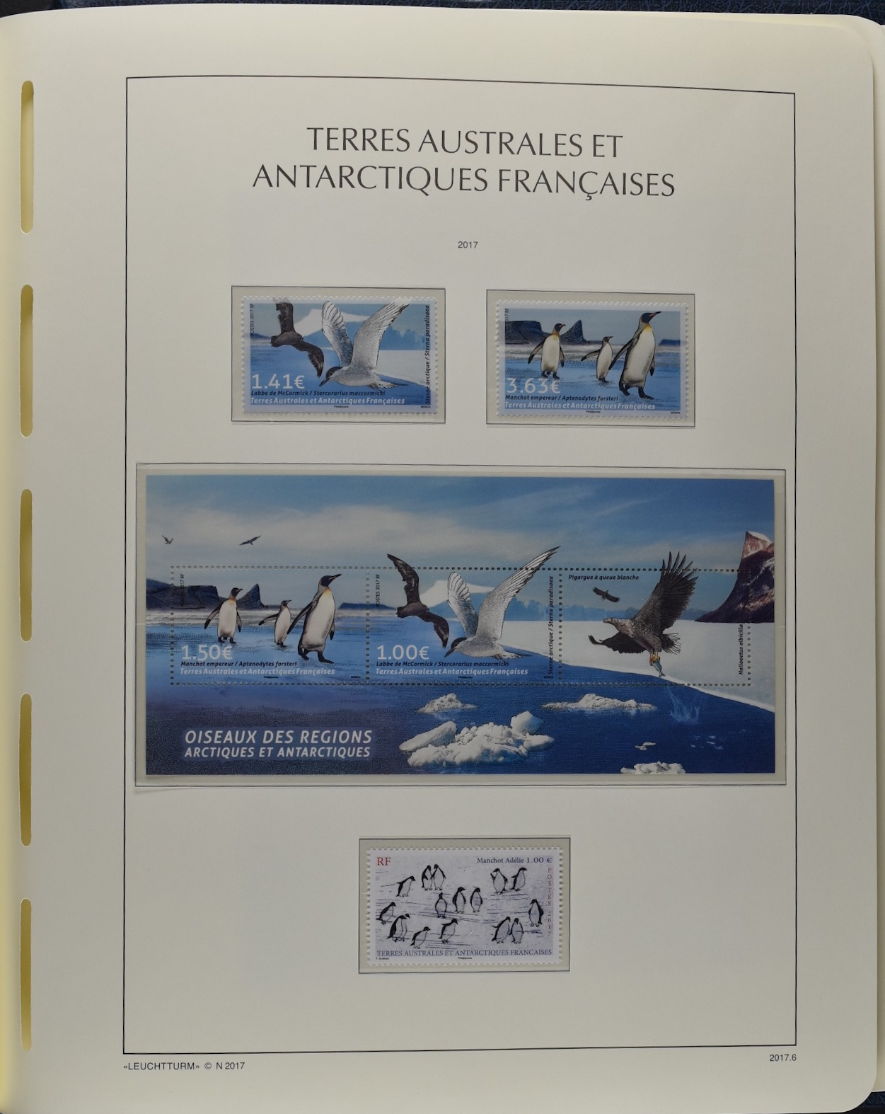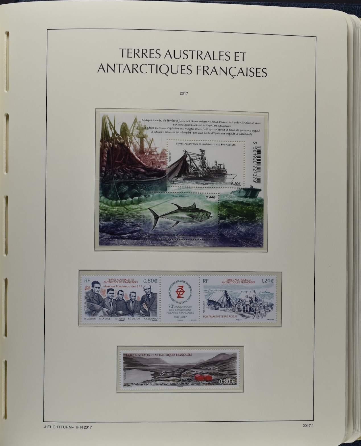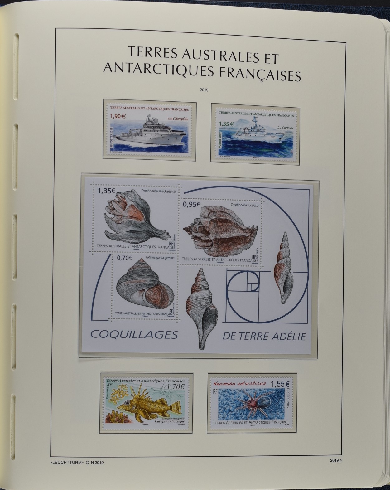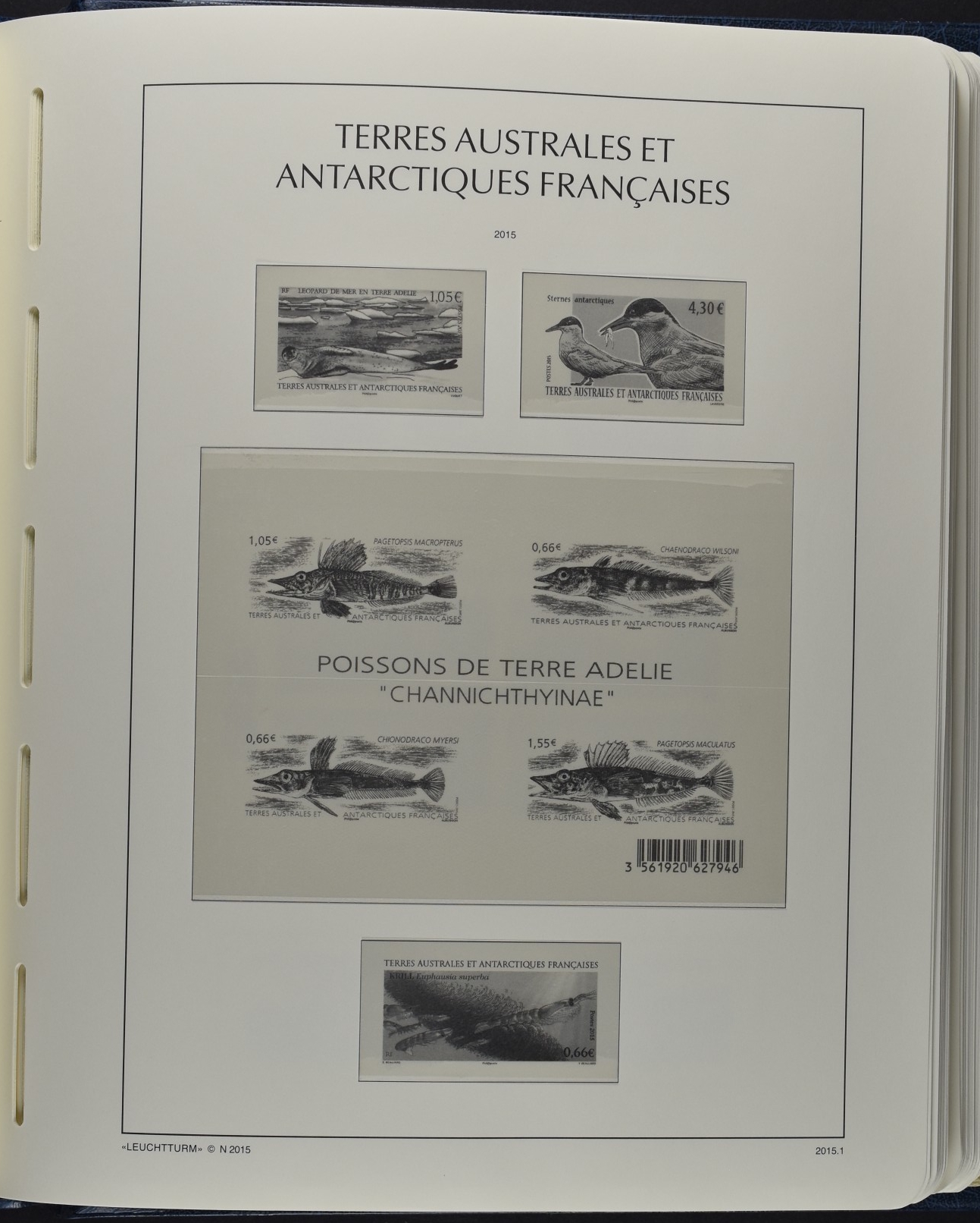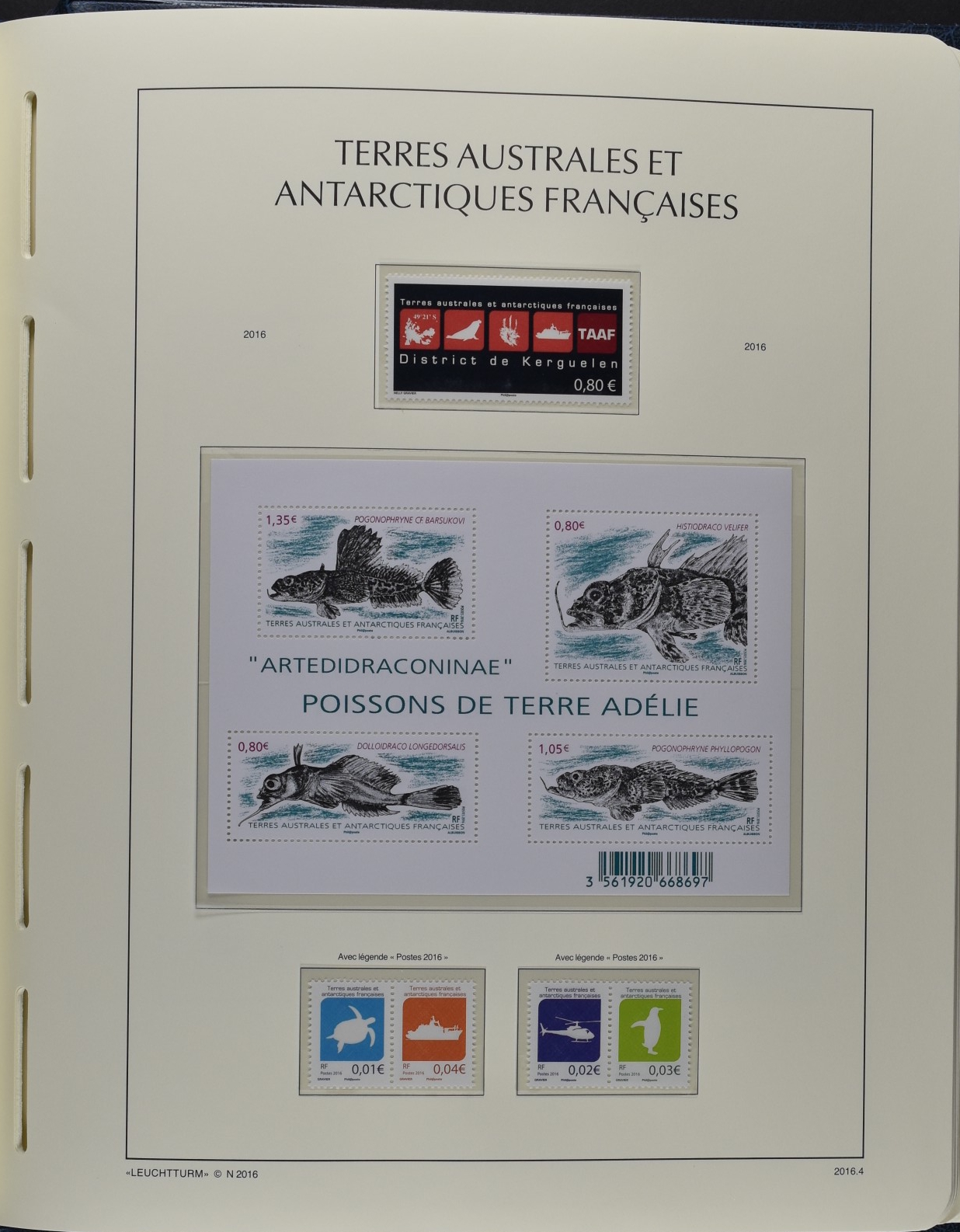 Prachtvolle moderne Sammlung der Französischen Austral- und Antarktisgebiete im luxuriösen Leuchtturm-Vordruckalbum mit Schuber. Nahezu vollständig, nur wenige Lücken, durchgehend in postfrischer Erhaltung. Die Sammlung besticht durch zahlreiche attraktive Ausgaben mit Motiven aus der Tier- und Pflanzenwelt, darunter viele Blöcke und Markenheftchen. Abgedeckt wird der Zeitraum 2010–2023, mit einem Katalogwert gemäss Yvert von rund € 1’160. Ergänzt wird die Kollektion durch eine Partie der Jahre 2001–2009 im Einsteckbuch mit einem zusätzlichen Yvert-Katalogwert von ca. € 450. Gesamtkatalogwert somit ca. € 1’610.