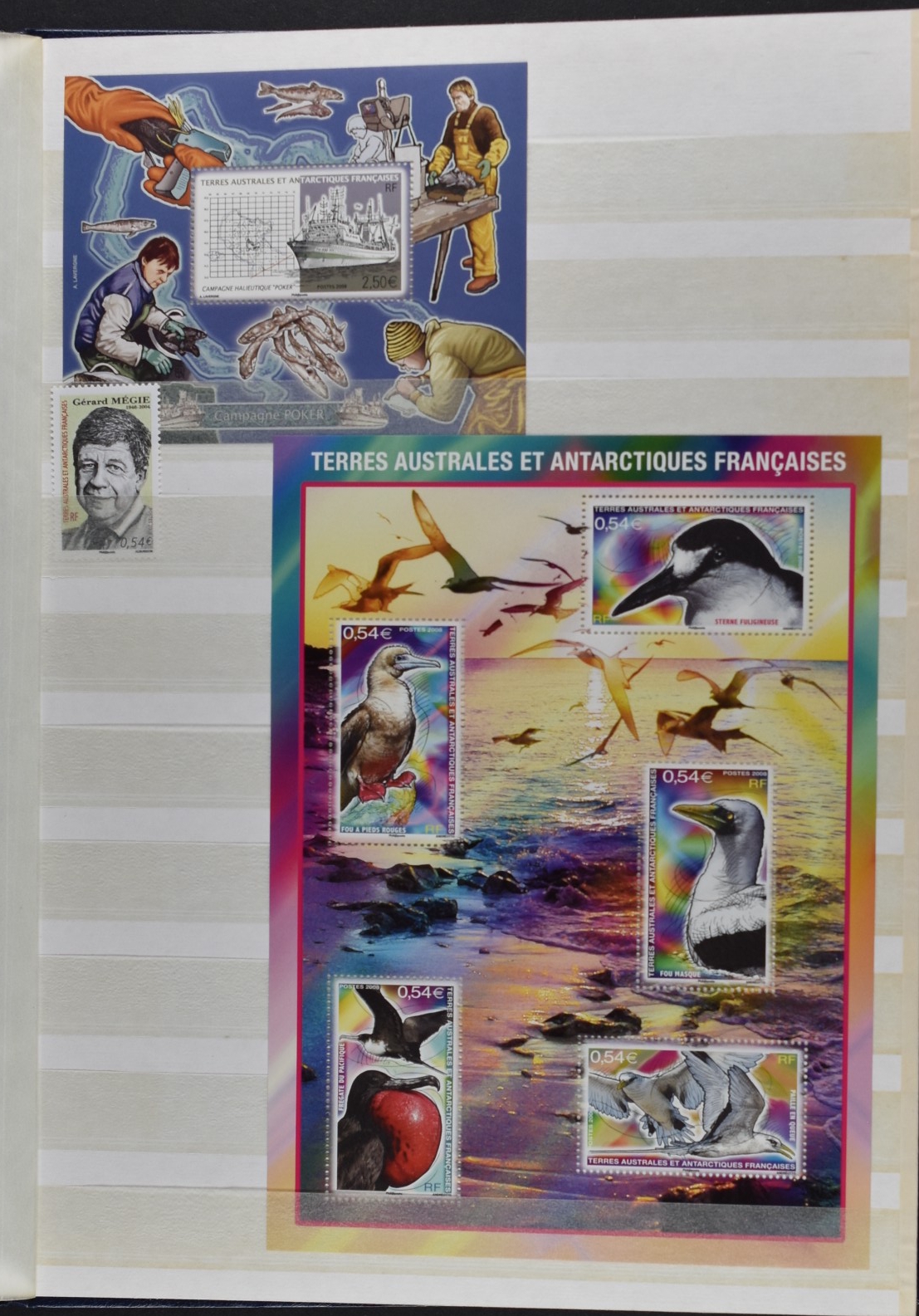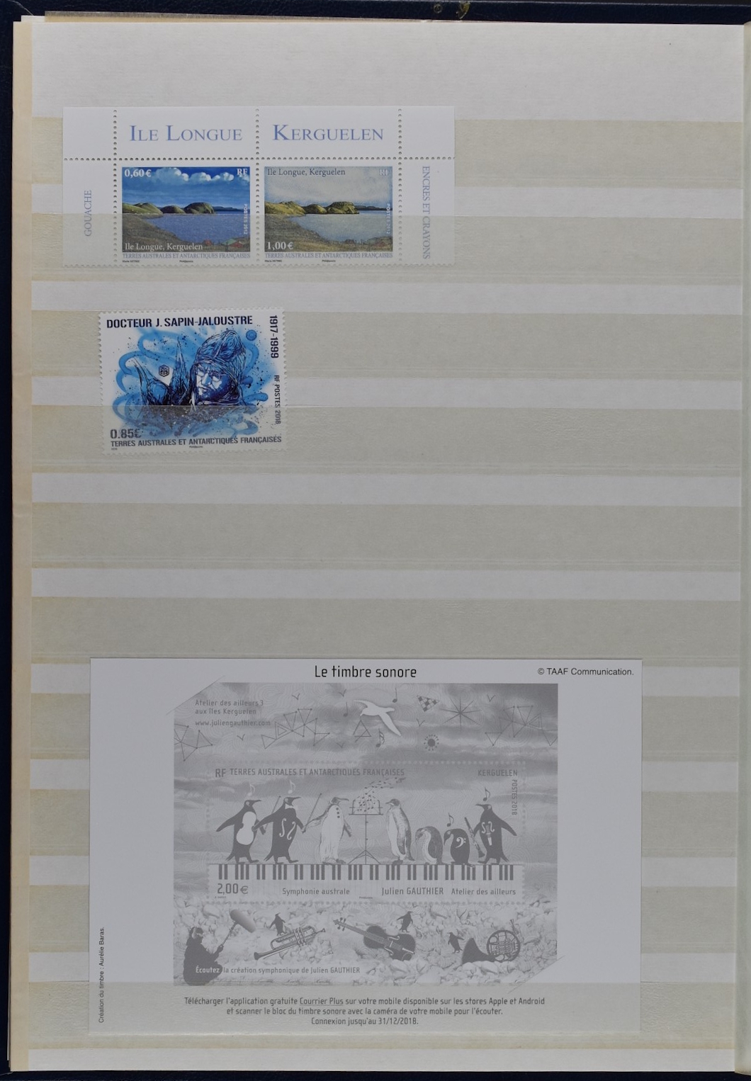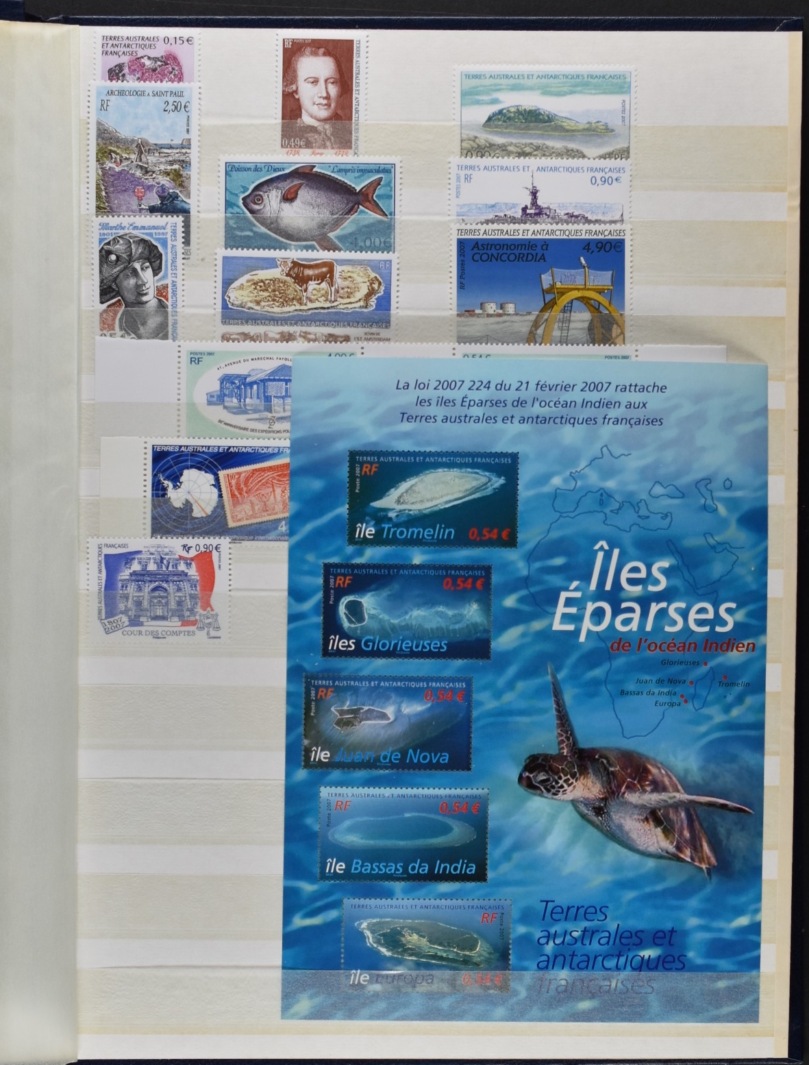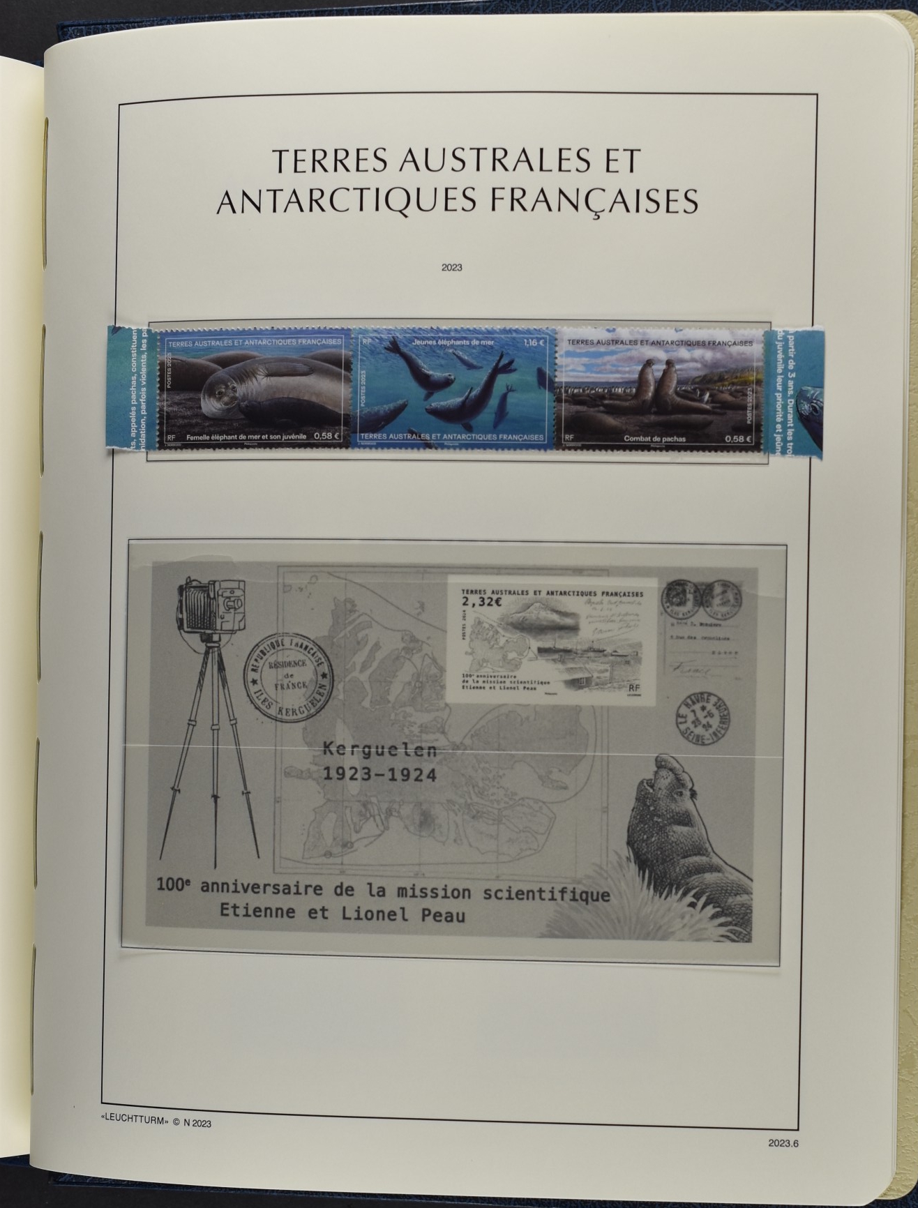Superb modern collection of the French Southern and Antarctic Territories, housed in a luxury Lighthouse printed album with slipcase. Virtually complete 2010–2023, unmounted mint throughout, including numerous miniature sheets and booklets with attractive fauna and flora designs. Catalogue value c. €1,160 (Yvert). In addition, a supplementary selection 2001–2009 in stockbook, c. €450 (Yvert). Total catalogue value approx. €1,610.