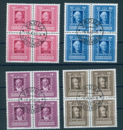 LIECHTENSTEIN, PRINCES PORTRAITS (II) 1942, BLOCKS OF 4 VERY FINE USED / Liechtenstein, Fürstenportraits (II) 1942, Viererblöcke gestempelt