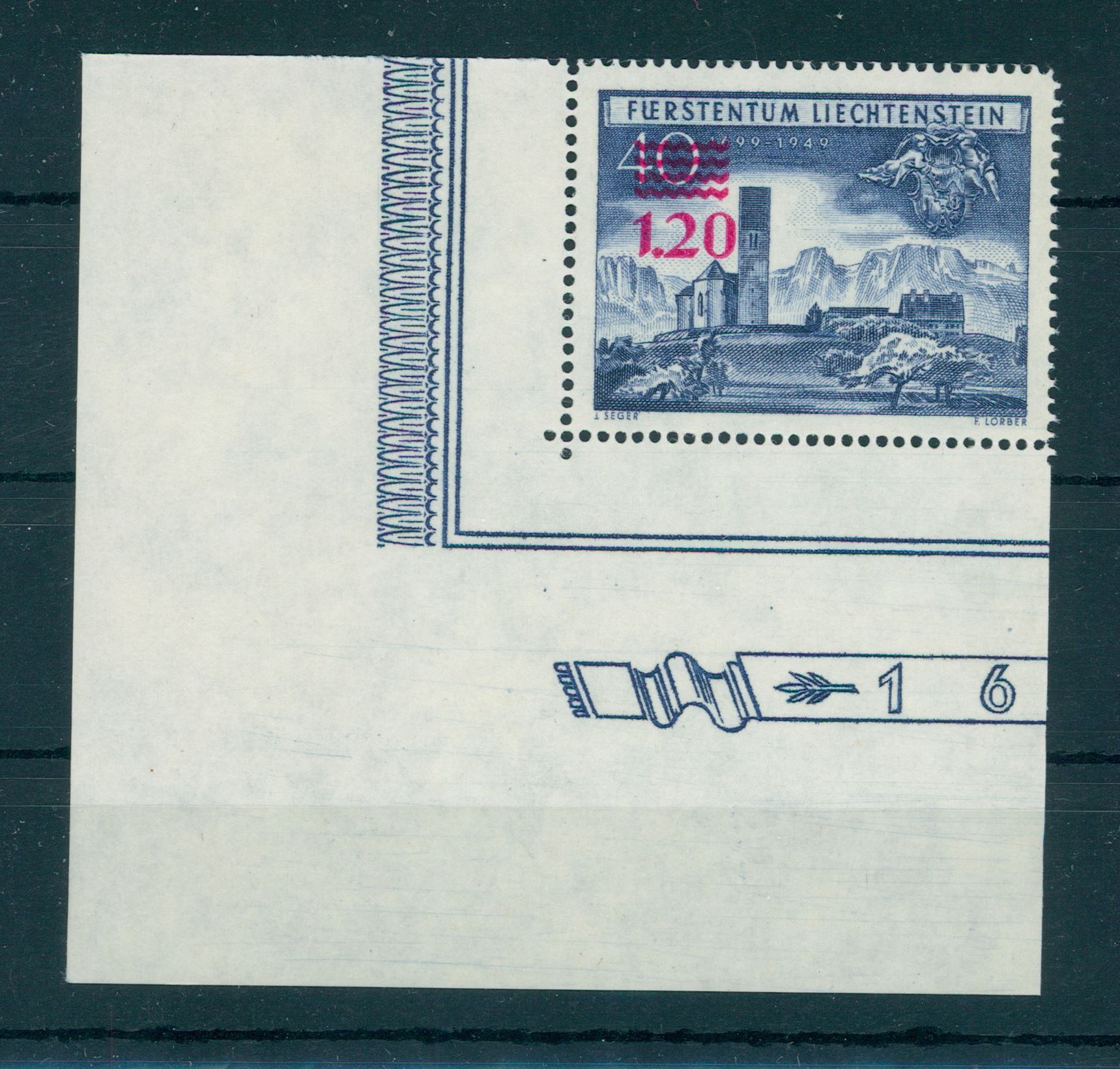 LIECHTENSTEIN,  PROVISIONAL 1.20 on 40 c. 1952, MNH STAMP FROM LOWER LEFT CORNER /Liechtenstein 1952 Provisorium 1.20/40 Rp., postfrisch, linke untere Ecke