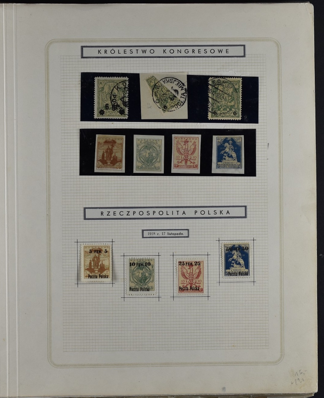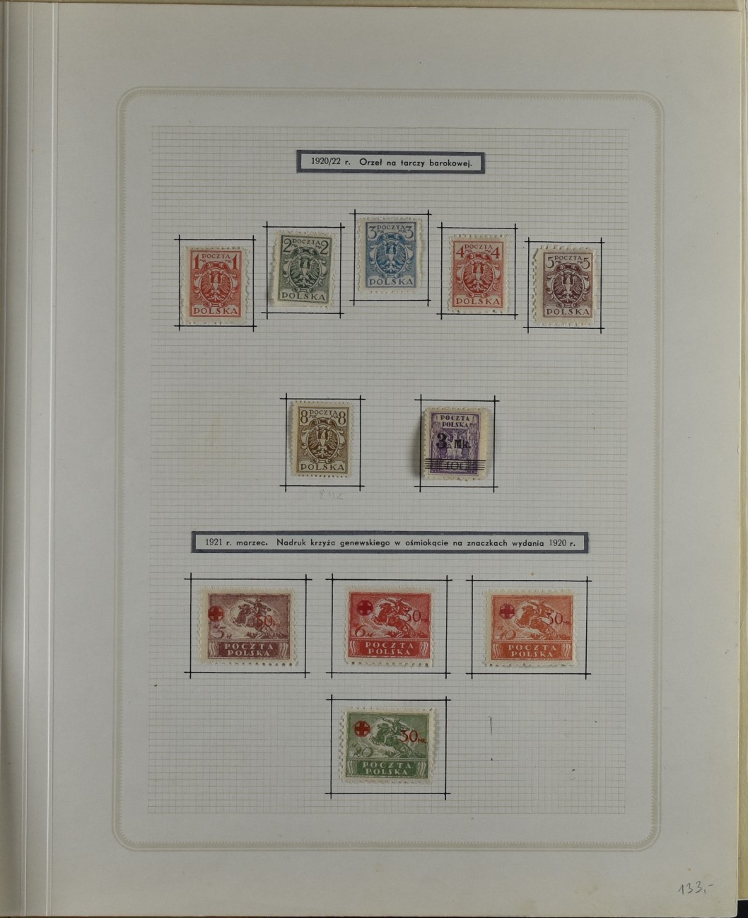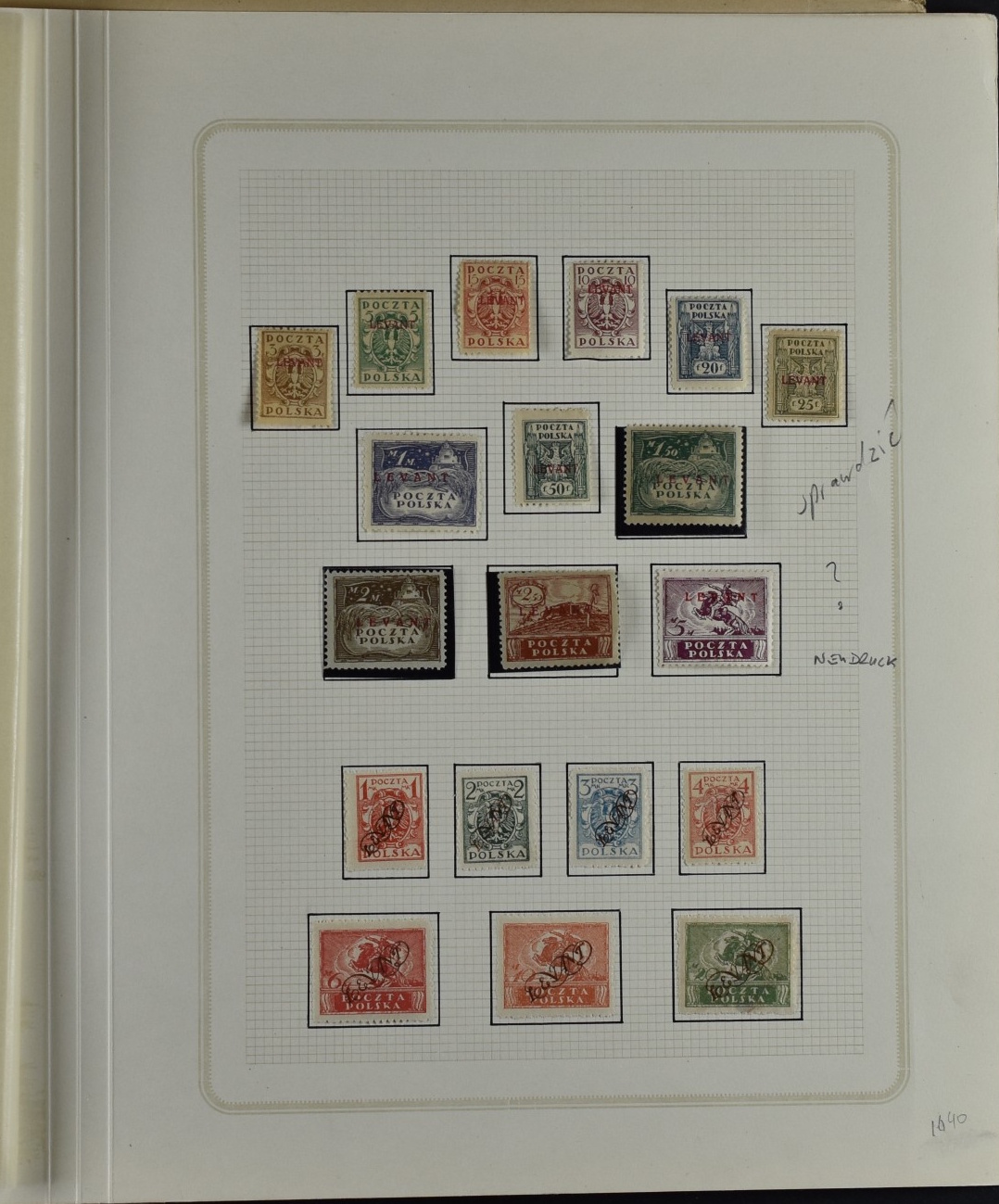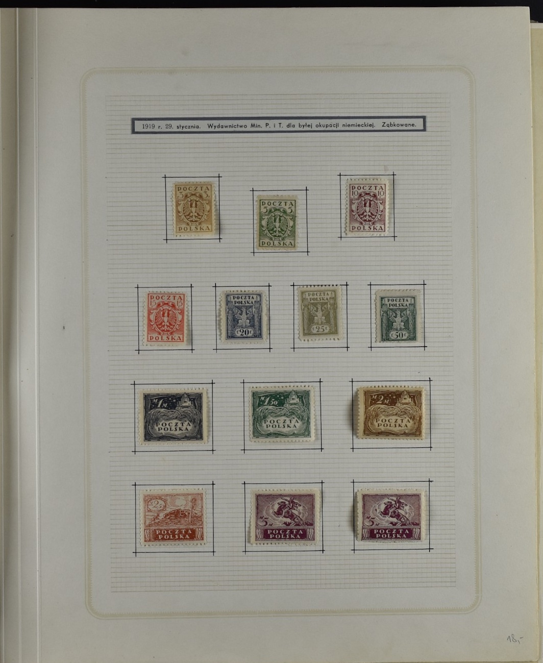 Fairly good remainder collection with only a few stamps removed by the previous owner, including overprints and miniature sheets, unchecked. Good page with city post Żarki stamps (all genuine), Przedbórz (many genuine), stamps for the Warsaw city post (never issued) 8used  for the first Polish issue of 1918, without overprint and imperforate. Collection Includes Krakow surcharges (not guaranteed), Levant set, possibly reprints. 1:1 as received.