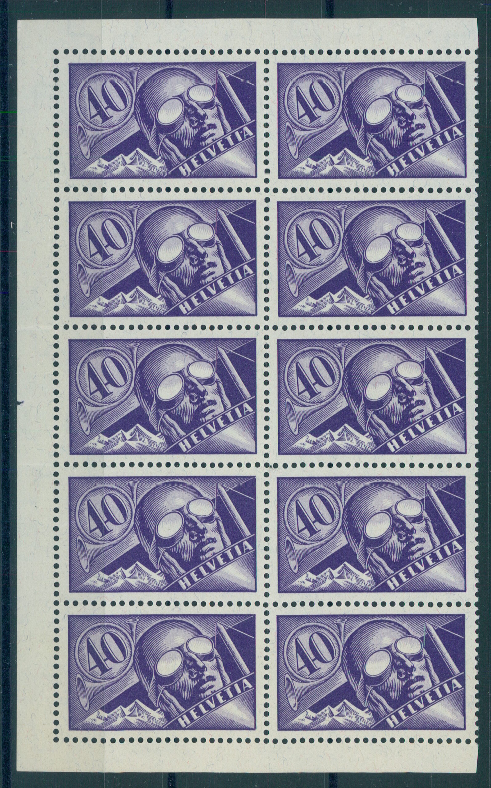 40 Rp. Flugpostmarke in postfrischem Block zu 10 Marken, SBK Nr. F6, Mi Nr. 181x, Katalogwert CHF 650