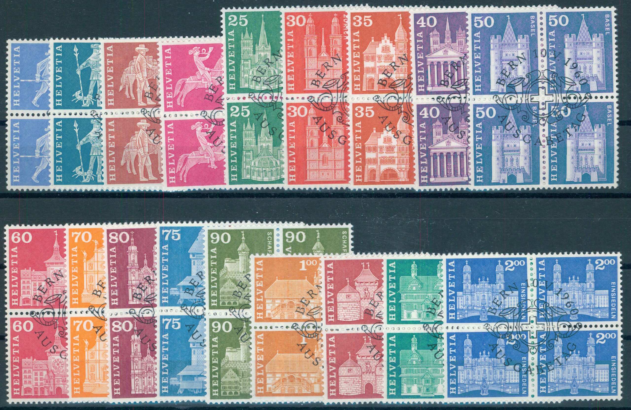 Vollständige Serie 355–372 (Michel 696–713), alle sauber am Ersttag entwertet. Frische und ansprechende Viererblocks, als komplette Einheiten recht selten. CHF 300