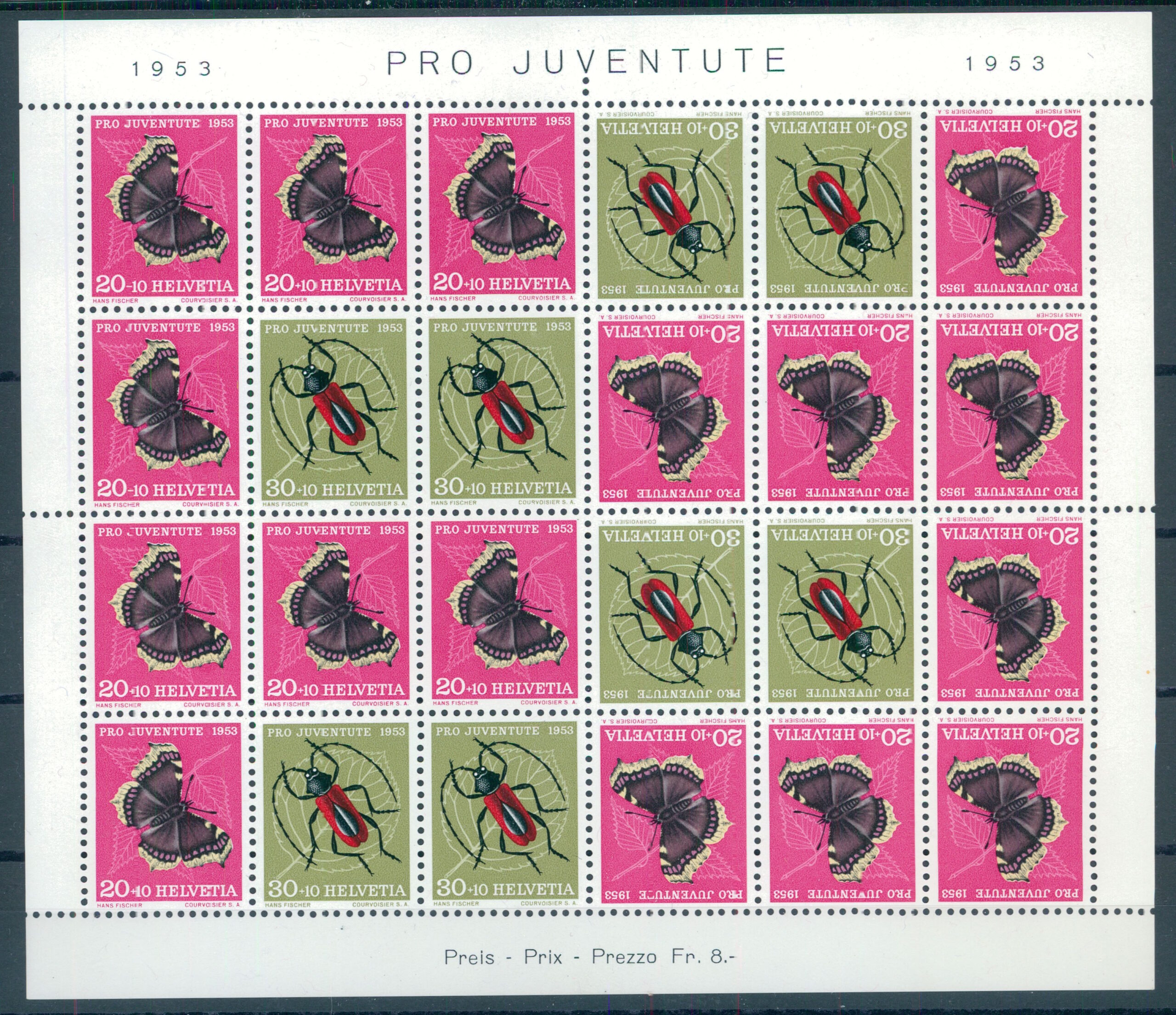 SWITZERLAND – MINISHEET PRO JUVENTUTE “BUTTERFLIES & BUGS”, 1953, UNUSED / NEVER HINGED / SCHWEIZ – PRO JUVENTUTE-Kehrdruckbogen „SCHMETTERLINGE & INSEKTEN“, 1953, POSTFRISCH