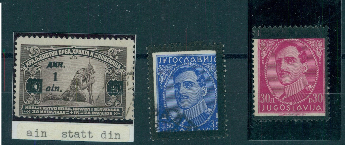 Surcharge stamp 1 on 15 Par, instead “ain” instead of “Din” (Mi #162), mourning issue 3.50 Din blue (Mi #292) used and 30 Din unused (Mi #298) , both with misplaced black overprint